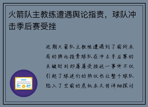 近期,火箭队主教练遭遇到了前所未有的舆论指责,球队在冲击季后赛的关键时刻却屡屡受挫。这一事件不仅引起了球迷们的热议,也让整个球队陷入了空前的危机。本文将详细探讨这次舆论风波的来龙去脉,并分析其对球队未来发展的深远影响。