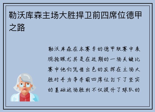 希望这篇软文能够充分展现勒沃库森主场大胜的辉煌时刻,并为读者带来关于球队前四争夺战的深刻认识。